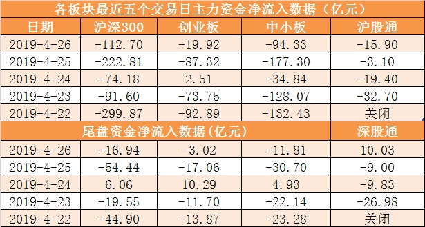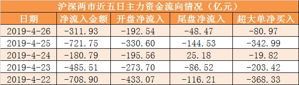 本周两市主力资金累计净流出2408.89亿元。其中周五(4月26日)主力资金开盘净流出192.54亿元,尾盘净流出48.47亿元,全天净流出311.93亿元。