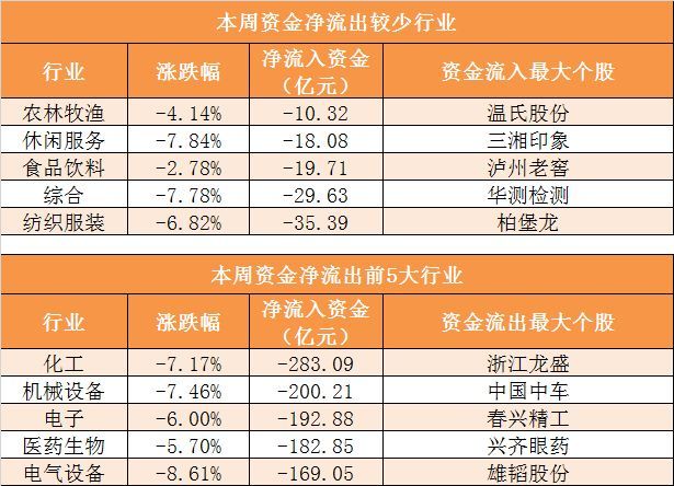 本周28个申万一级行业中,无一行业实现资金净流入,化工、机械设备、电子、医药生物等行业净流出规模居前,其中化工行业净流出283.09亿元居首。