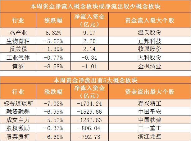 概念板块方面,本周鸡产业、生物育种、反关税、工业气体等概念板块资金呈现净流入,其中鸡产业概念净流入9.17亿元居首。