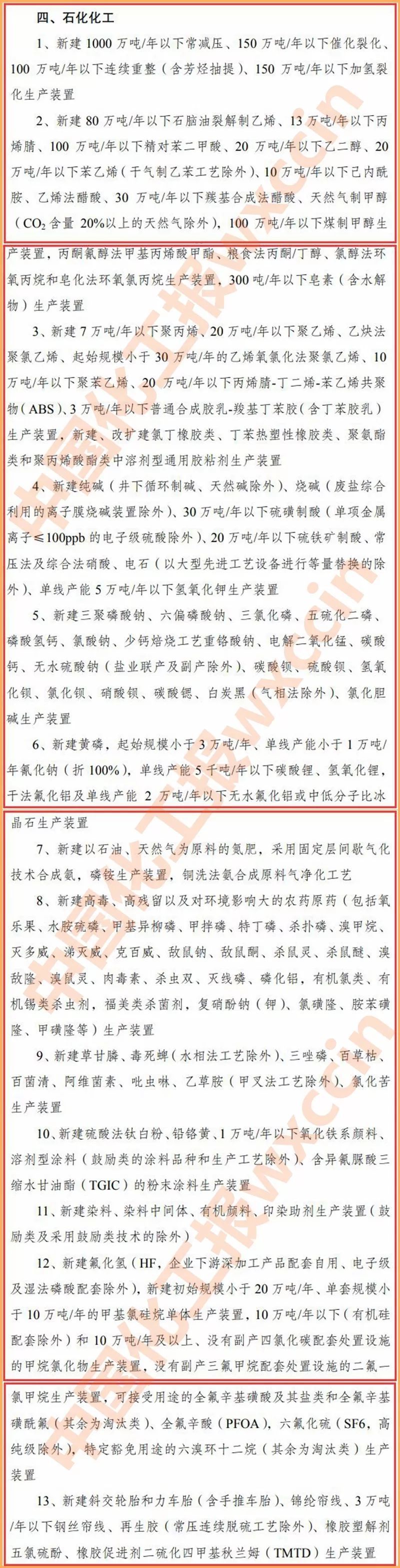 石化化工行业鼓励类有17大类,比征求意见稿少了3大类,包括:高标准油品生产技术开发与应用,煤经甲醇制对二甲苯;硫、钾、硼、锂、溴等短缺化工矿产资源勘探开发及综合利用;零极距、氧阴极等离子膜烧碱电解槽节能技术、废盐酸制氯气等综合利用技术、铬盐清洁生产新工艺的开发和应用;10 万吨/年及以上离子交换法双酚 A、15 万吨/年及以上直接氧化法环氧丙烷、20 万吨/年及以上共氧化法环氧丙烷、万吨级己二腈生产装置;高效、安全、环境友好的农药新品种、新剂型、专用中间体、助剂的开发与生产;染料、有机颜料及其中间体清洁生产、本质安全的新技术等。