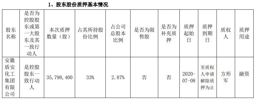 公告显示,股东盾安化工本次质押3579.84万股,占其所持股份比例33%,占公司总股本比例的2.87%,质押期限自2020年07月08日至质权人申请解除质押为止。