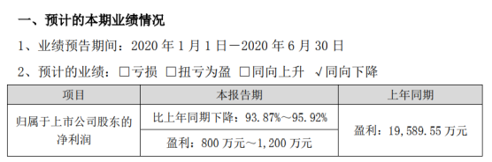 挖贝网 7月10日消息,华昌化工(002274,股吧)(002274)发布2020年半年度业绩预告:去年预计盈利800万元-1200万元,上年同期盈利1.96亿元,同比下降93.87%-95.92%。