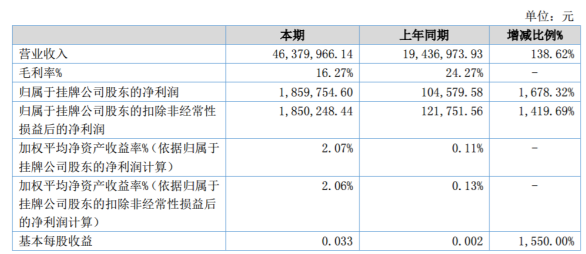 挖贝网 9月3日消息,国德医疗(833390)近日发布2020年半年度报告,2020年上半年公司实现营业收入46,379,966.14元,同比增长138.62%;实现归属于挂牌公司股东的净利润1,859,754.6元,同比增长1,678.32%。