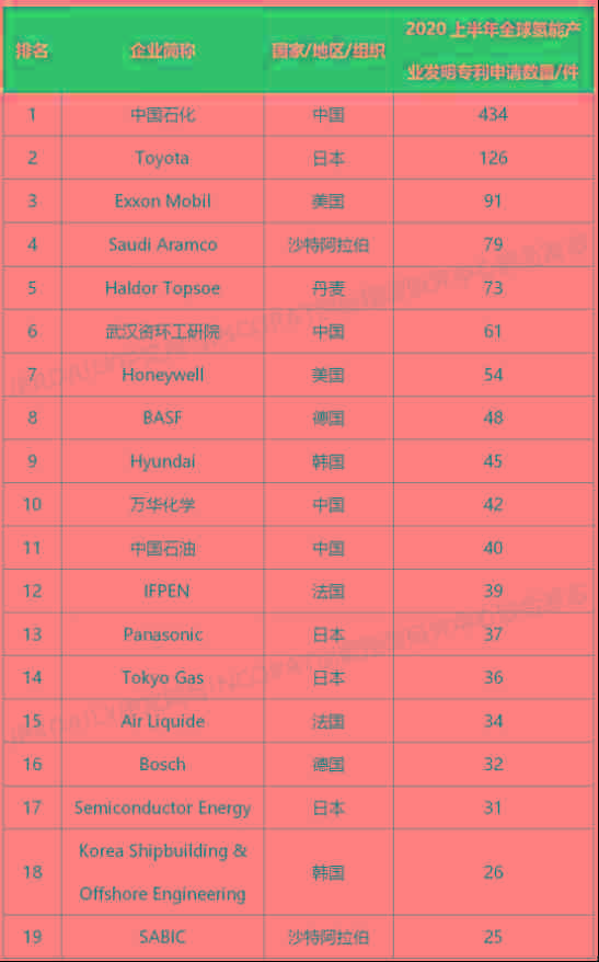(IPRdaily中文网与incoPat创新指数研究中心联合发布2020年1~6月全球公开的氢能产业发明专利申请数量进行统计排名)