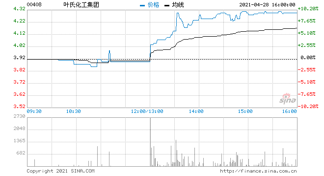 叶氏化工集团(0408.HK)午后开盘大幅拉升,现涨9.69%,报4.3港元,创2014年12月以来新高价,总市值24亿港元。