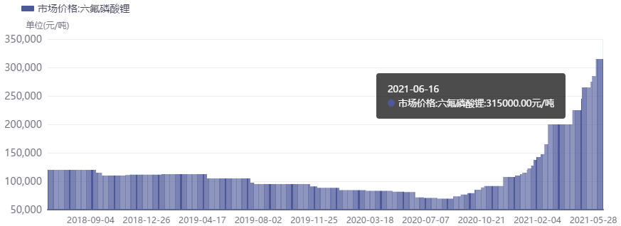 六氟磷酸锂的价格近期水涨船高,5月末,锂电池龙头宁德时代(300750,股吧)与上游供货商天赐材料(002709,股吧)签订六氟磷酸锂供货长单,锁定产能。最新的价格数据显示该类原料价格已飙涨至31.5万元/吨,再度突破近年新高点。