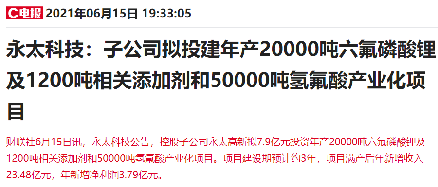 昨晚,A股上市公司永太科技(002326,股吧)发布公告,控股子公司拟7.9亿元投资年产2万吨六氟磷酸锂及其他相关产能,项目建设期预计约3年。而2020年,国内六氟磷酸锂的产能还在约6万吨。如永太科技控股子公司产能建设成功,将对国内六氟磷酸锂的市场格局形成较大影响。
