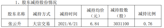 公告显示,减持前张云升合计持有公司股份75,128,600股,本次减持后持有股份72,097,500股,占总股本比例18.1%。